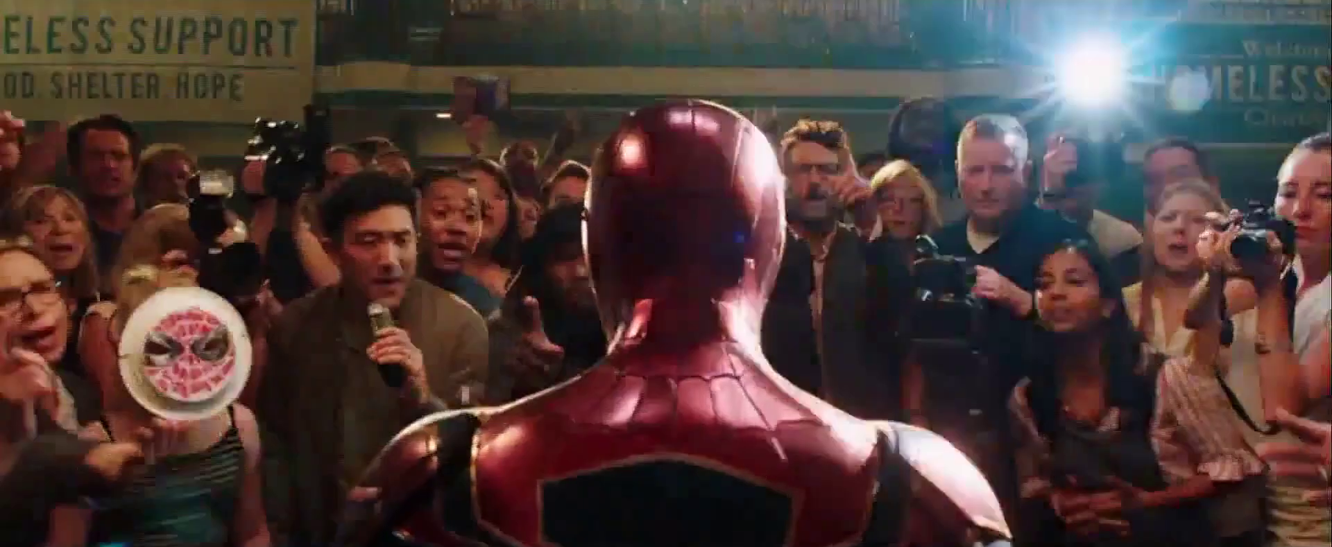 While taking Jones on a date as Spider-Man across the city, they land at Madison Square Garden where on several billboard screens across the city, NY1 anchor Pat Kiernan announces that, much to Parker's horror, controversial online news reporter J. Jonah Jameson of The Daily Bugle released altered footage of the Battle of London. The broadcasted story of Mysterio's last words on a confession video directly incriminated Spider-Man for the Elemental attacks, and ousts Spider-Man's identity as Peter Parker to the world.